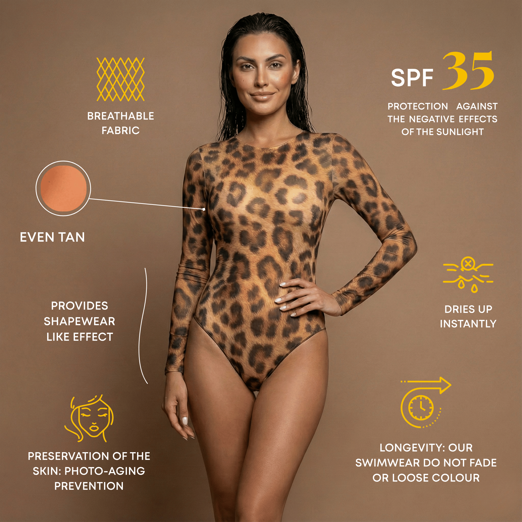 This file features sustainable tan-through smart swimsuits adorned with the iconic leopard print. With a one-piece swimsuit design including sleeves, it offers chic silhouettes for sophisticated beach style