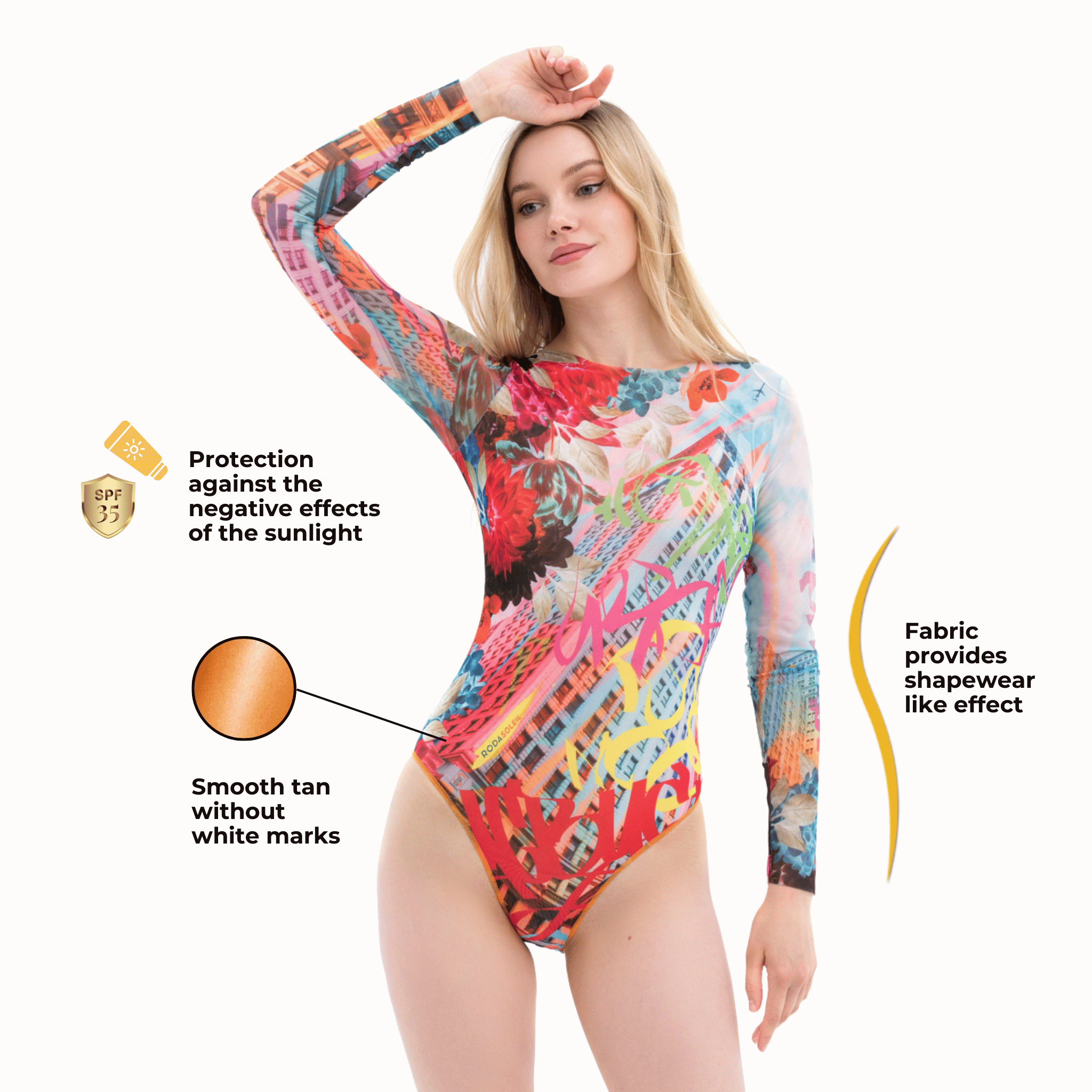 This file introduces the world's top sustainable smart swimsuit brand, showcasing a graffiti print one-piece with sleeves. Inspired by the runway, it offers innovative tan-through technology